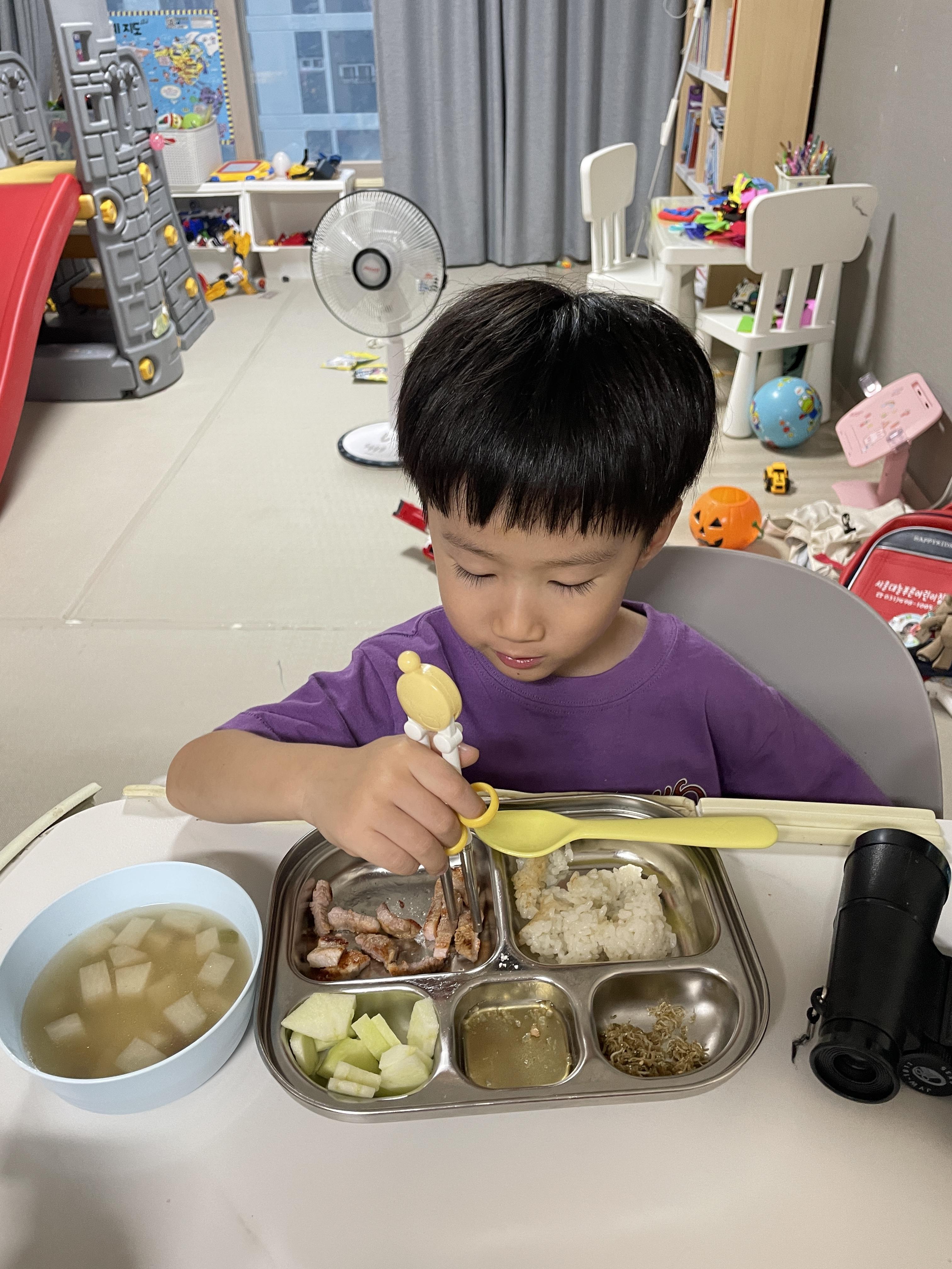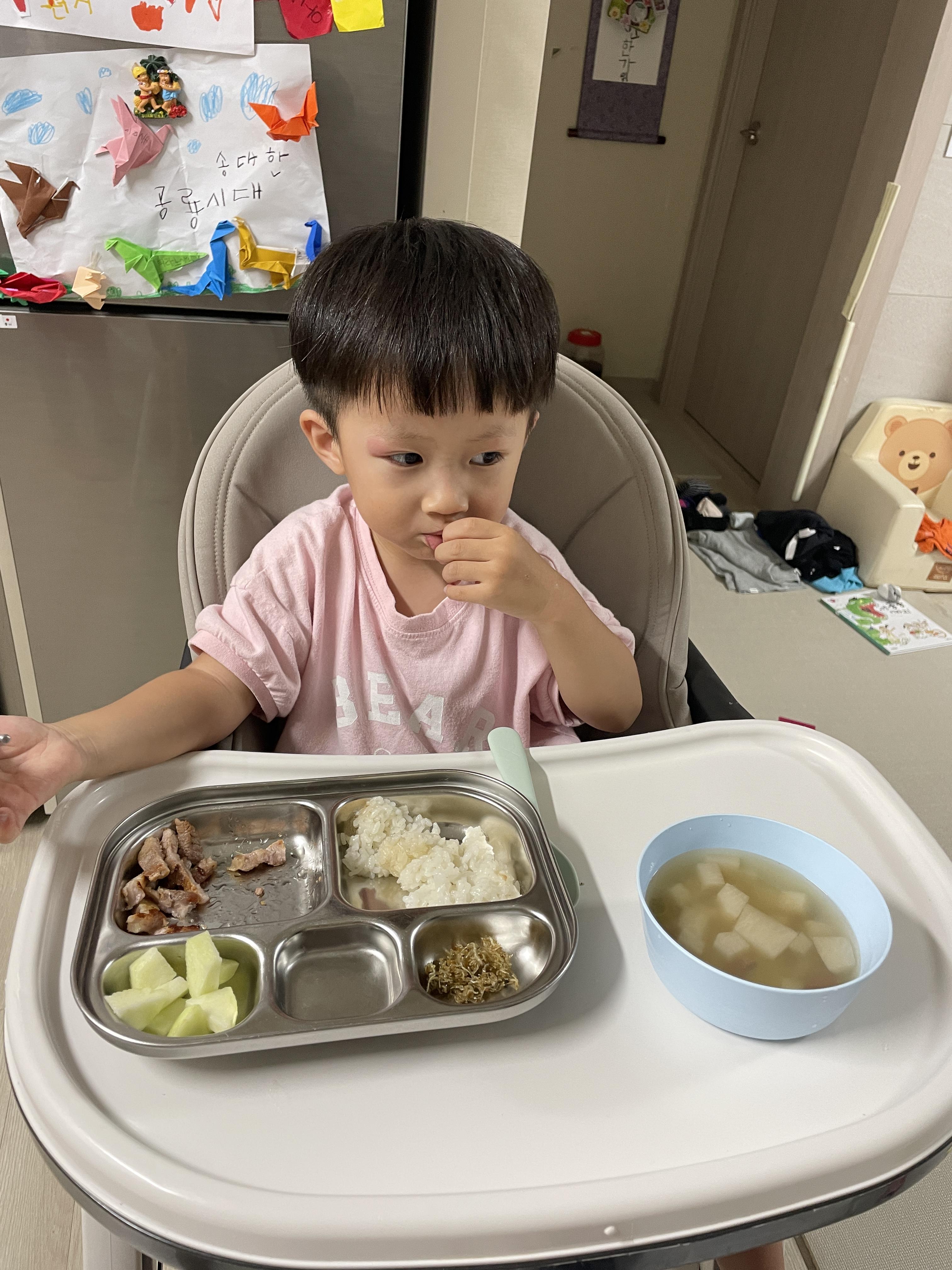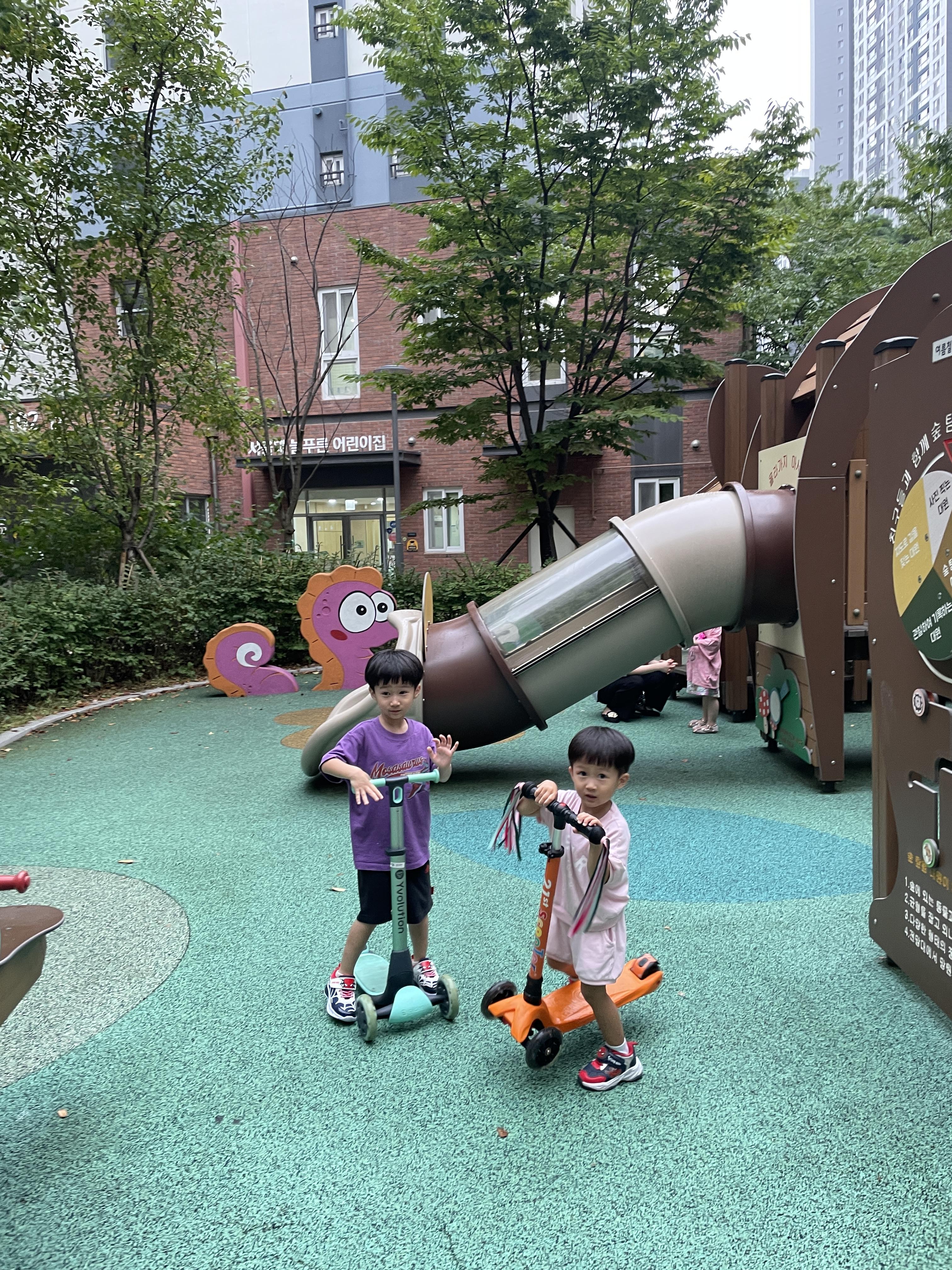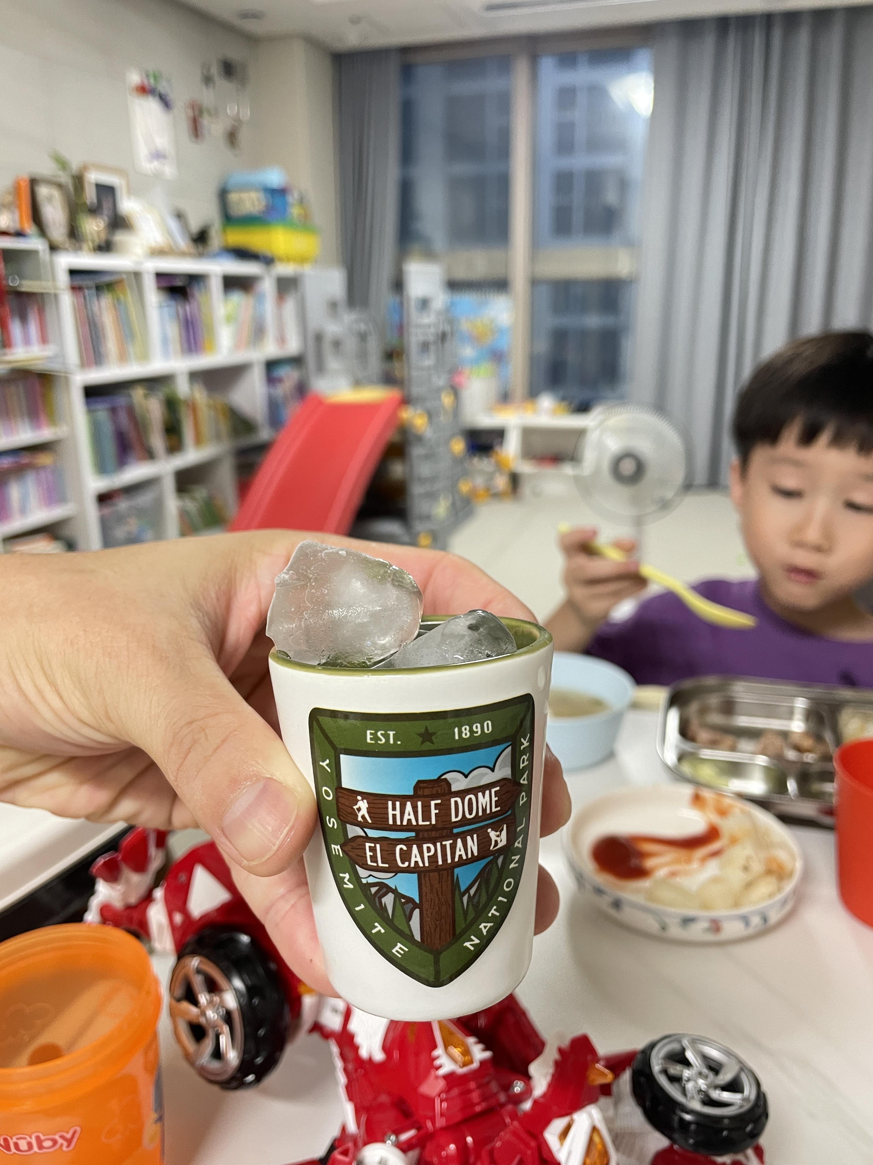 어린이집에 늦게 남아있던 형아 챙기는 초한이🥳 놀이터에서 좀 놀다가 집에 와서 저녁 맛나게 먹었다. 나도 선미가 요세미티에서 사온 잔으로 소주 한잔하며 삼겹살이랑 저녁 자알 먹었다👍