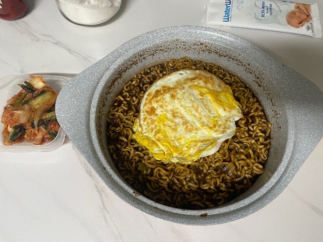 짜파게티 2개, 후라이 2개 점심으로 먹고 집 정리 하고 하원🍝
