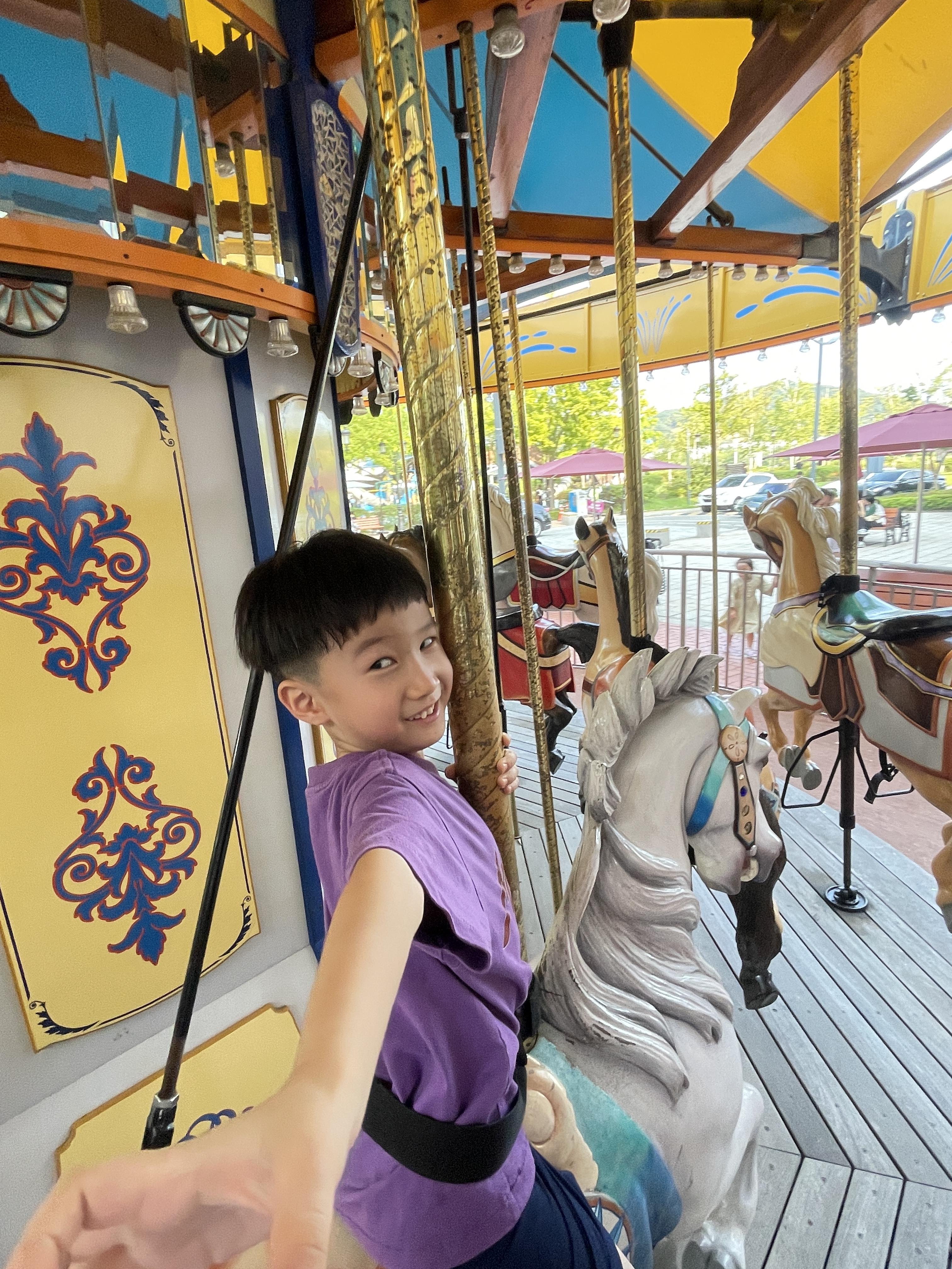 돈도 안넣은 오락기에서 신나게 오락하는 아가들🤪 놀이터에서 놀다가 회전목마 탑승ㅋㅋ 우리 대한이가 원래 회전목마 타는걸 거부했는데 웬일인지 오늘은 탄단다. 아무래도 활발한 동생의 영향인듯?